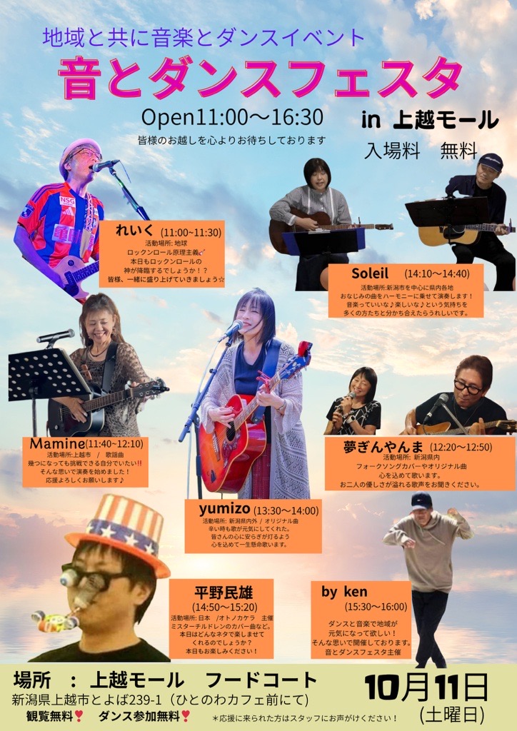 2025.10.10 10/11(土)音とダンスフェスタ🎶 第21回「音とダンスフェスタ」開催! 日時:10/11(土)11:00~16:30 場所:上越モール「フードコート」 ★入場・観覧・ダンス参加無料