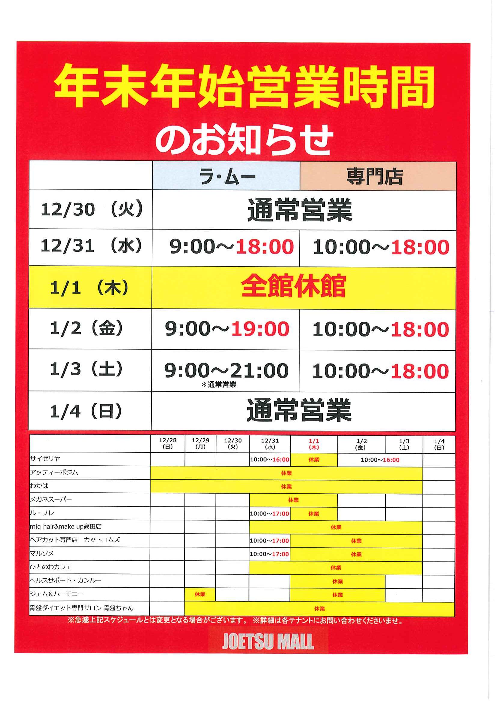 2025.12.19 年末年始の営業時間のお知らせ いつも上越モールをご愛顧いただきありがとうございます。 上越モールの年末年始(12/28~1/4)の営業時間は、以下の通りとさせていただきます。 ご理解のほどよろしくお願いいたします。